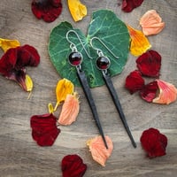 I forged my coffin nail earrings on Wednesdays. I make offerings to Odin and to the Norns and ask their blessing for these. Nails are traditionally used to drive away malevolent forces, along with a variety of other uses. I chant into my sets runes of protection and other appropriate magic. This pair has 10mm garnet set in Sterling silver. The ear wires are sterling silver. They will work as candle scribes in a pinch.